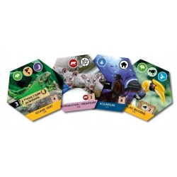 Dans le jeu Sanctuary, chaque joueur dispose de quatre cartes d’action personnelles, dont la puissance dépend de leur position sur la ligne d’action. Trois cartes permettent d’introduire des animaux dans un habitat spécifique (forêt, roche ou eau), tandis que la quatrième permet de développer des projets structurants. Les effets variés des tuiles enrichissent l’expérience en ajoutant des bonus, des synergies et des conditions à remplir pour progresser.